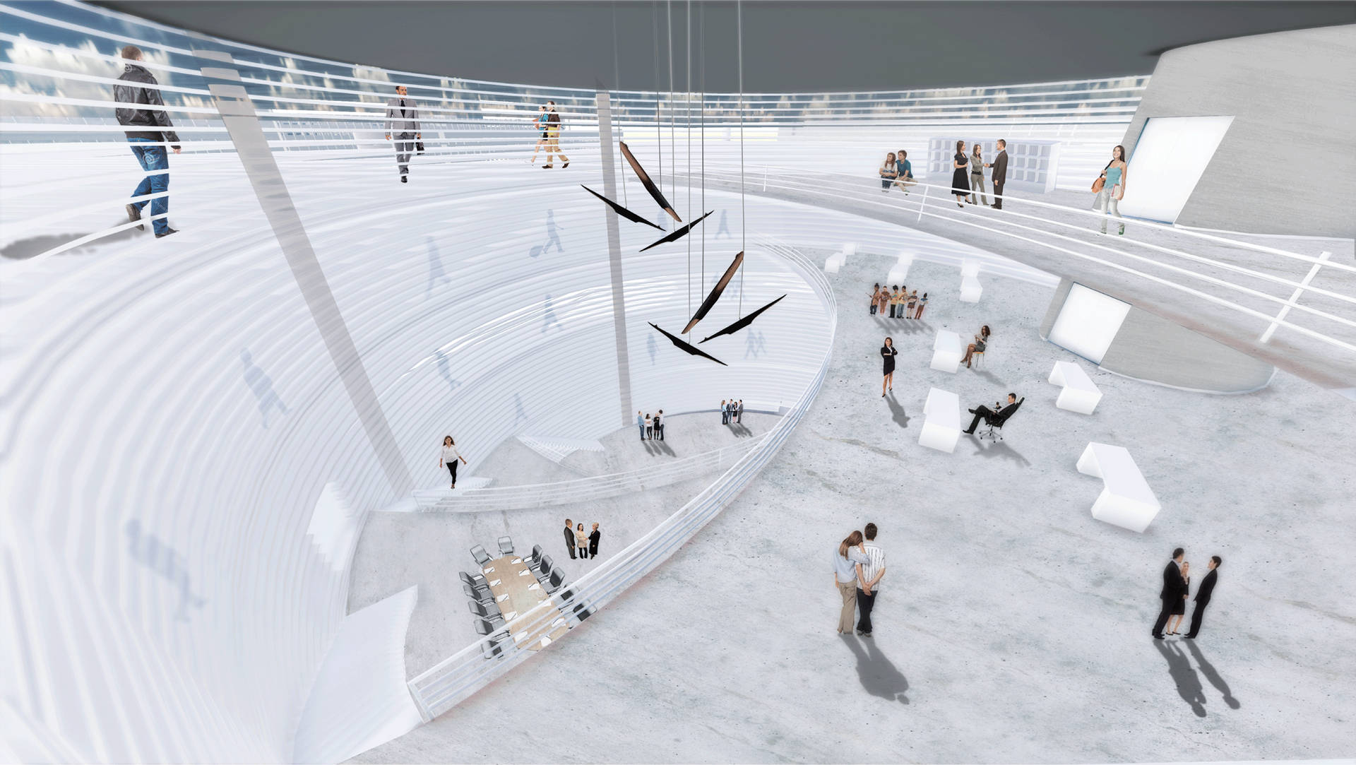 Media Center - Ft Lauderdale, FL A society is composed of two kinds of people: the Readers and the Writers. Confined in the same community, the two groups help each other through communication and observation. Writers create ideas, write the news and expose these thoughts to those who observe, the readers. Requiring maximal concentration, writers need silence and protection from sun damage while readers are open to observation and free to communicate these ideas freely. Comparing a society to a building, the design called for a media center where the user may go through the transformations of reader to writer as the loop of knowledge is an infinite one. Exploring with methods cast and molding, form is found through anti-form to provide for primary and secondary spaces within the mass, eliminating the possibility of any obstructions. Typically, exhibits display work that is completed after time of hard work. The outcome is known. However, taking a step back, one may be able to exhibit the initial intention of the maker where the outcome is in progress and ideas are evolving. The program calls for a library and the spiraling circulation wraps around the core to exhibit the creation of art rather than the produced art itself. The people circulating around may see those performing their tasks through the louvers which are thin enough to provide a transparency and keep out intrusive direct light. The voids are wide enough to not be only for circulation but may be used for social interactions where the contoured steps may be wide enough to create spaces, seats and screening facades. Dealing with a program that requires delicate transitions, users divide themselves in two main styles of spaces: the focus zones, and the sharing zones. Having both in one area causes distractions and discomfort to those who are trying to concentrate on given tasks and those who choose to roam freely. Rather than creating a whole new mass to accommodate the two users, the form’s spaces are fairly split through methods of anti-form. Now, the two types of users share the building through interior and exterior divisions.